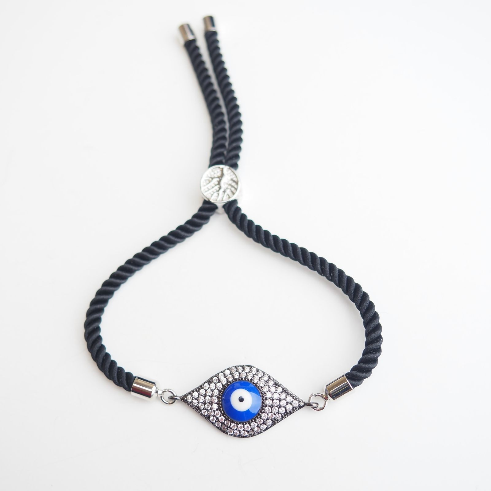 Adjustable Evil Eye CZ Bracelet with Black Rope in Gunmetal